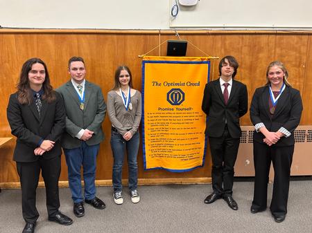 March 19, 2026| Five Cicero-North Syracuse High School students showcased their public speaking talents during the CNS Optimist Club 2026 Oratorical Contest, held Tuesday, March 3, at the Jerome F. Melvin Administrative Office Building. This year’s contest featured CNS senior Joey Cox, CNS sophomore Aleks Atakan Galway, CNS senior Noah Seitz, CNS sophomore Alexis Sturgeon and CNS senior Chloe Tice. Each student delivered an eloquent and heartfelt speech based on the 2026 theme, “The Moment I Realized I Belonged — My Definition of Community.” Pictured (left to right): Noah Seitz, Joey Cox, Alexis Sturgeon, Aleks Atakan Galway and Chloe Tice